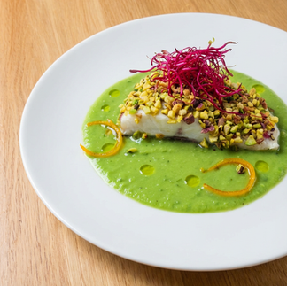 Zeebaarsfilet in een krokante pistache-korst.
